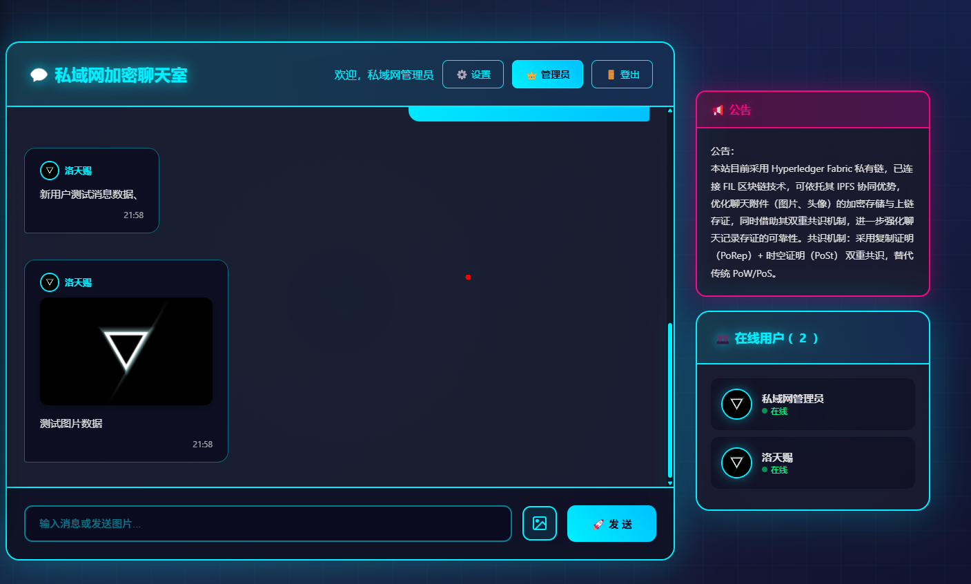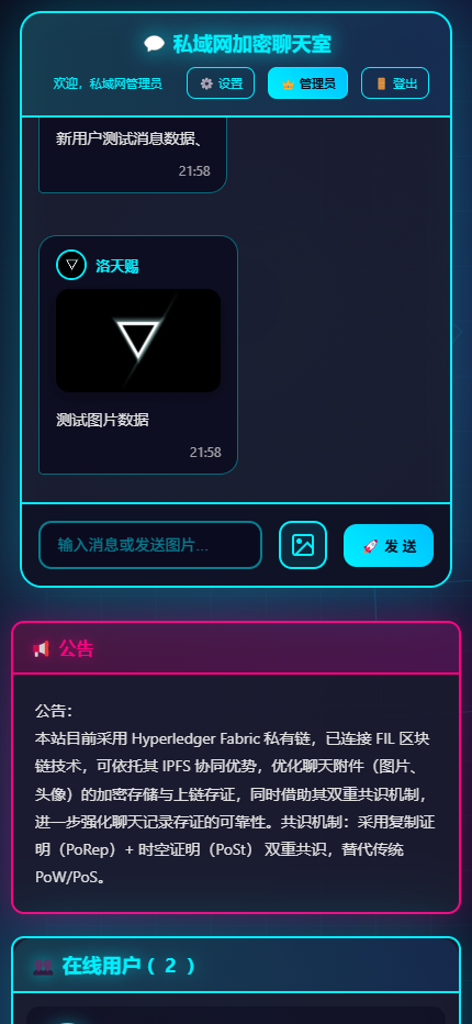 本站目前采用 Hyperledger Fabric 私有链,已连接 FIL 区块链技术,可依托其 IPFS 协同优势,优化聊天附件(图片、头像)的加密存储与上链存证,同时借助其双重共识机制,进一步强化聊天记录存证的可靠性。共识机制:采用复制证明(PoRep)+ 时空证明(PoSt) 双重共识,替代传统 PoW/PoS。